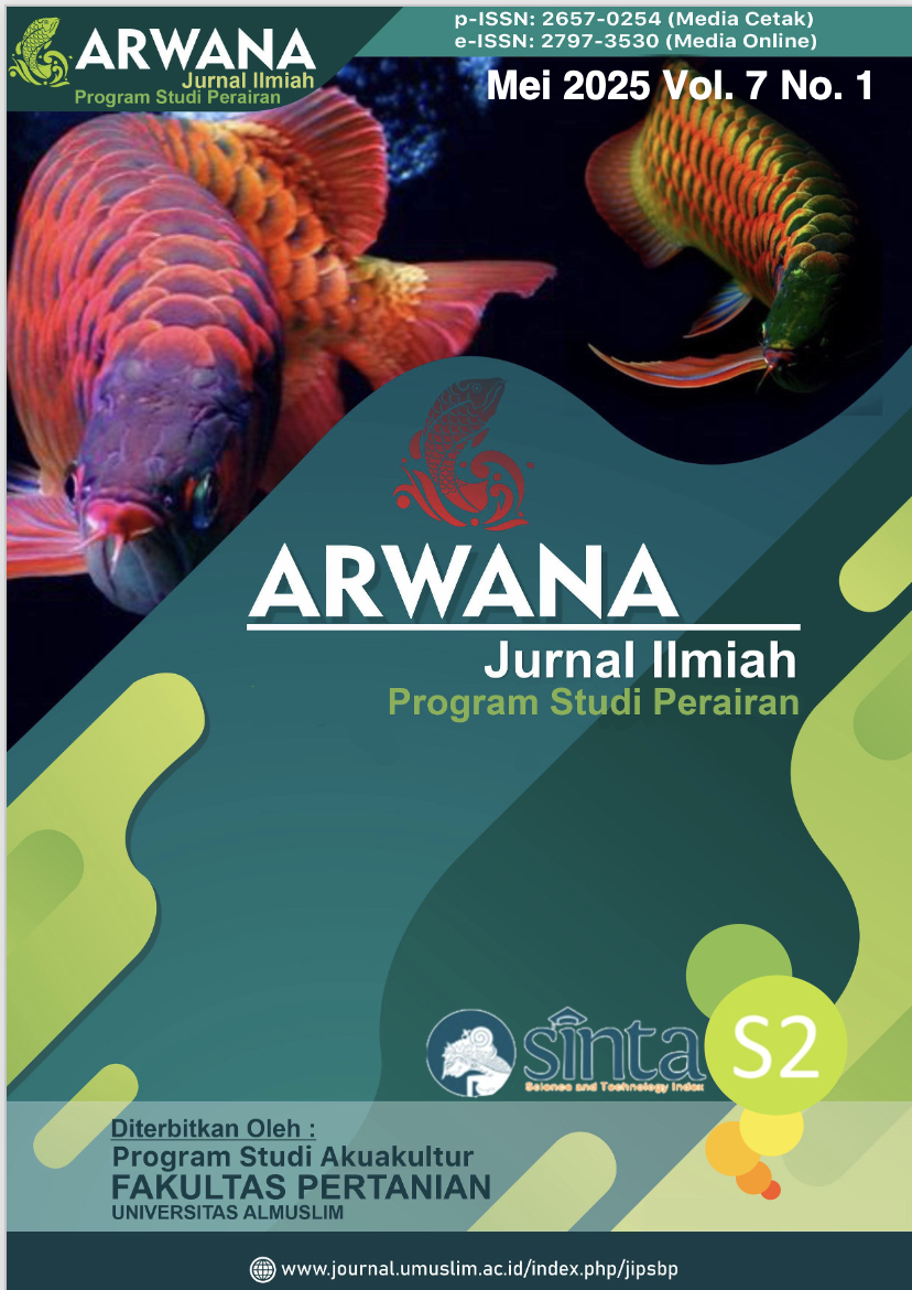 Vol. 6 No. 2Arwana: Jurnal Ilmiah Program Studi Perairan is a terakreditasi Sinta 2 journal (Number 10/C/C3/DT.05.00/2025) published by the Department of Aquaculture, Faculty of Agriculture, Almuslim University, Bireuen Aceh. Articles published in this journal are the results of research by lecturers and students in the field of Aquaculture and Fisheries. Arwana Journal is an article in the form of research results, and conceptual articles covering fisheries science, namely: Aquaculture, Fisheries Resources, Fisheries Socio-Economics, Fisheries Technology, Fisheries and Marine Biology. This journal is published in May and November each year. Every journal published goes through a double-blind review process in the process of reviewing an article to be presented where an article is assessed by two reviewers who do not know the identity of the author.